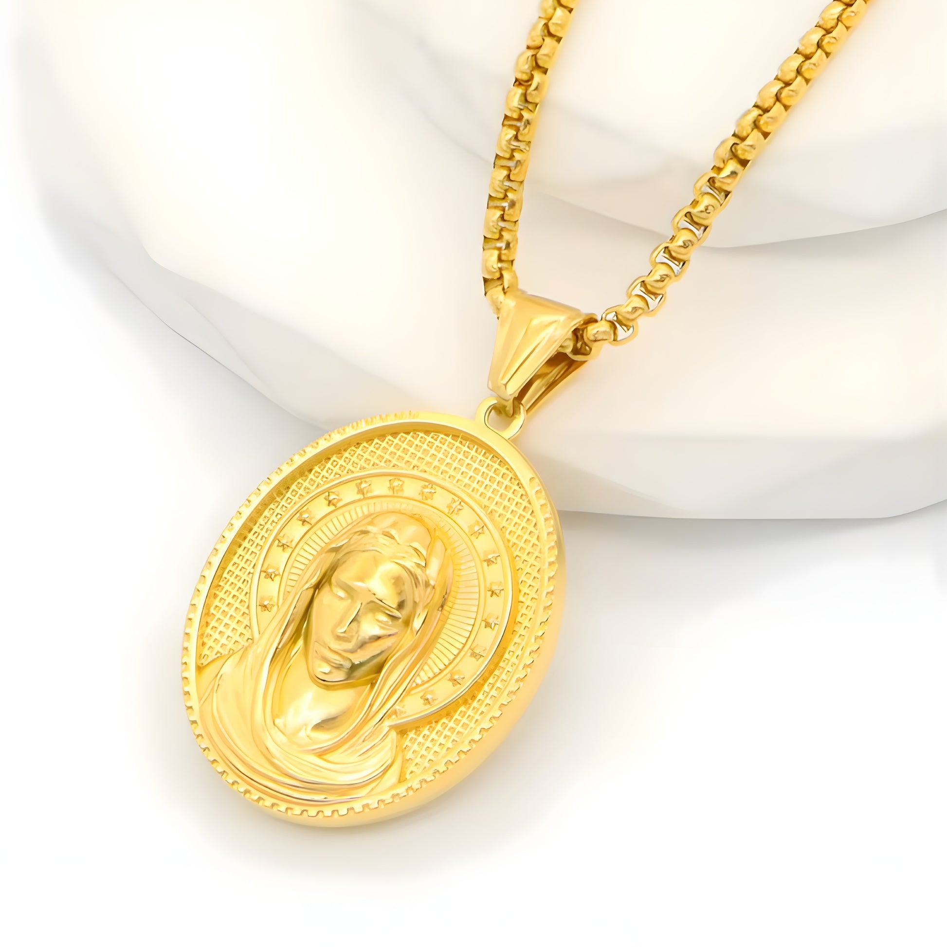 La cadena “Madre Sagrada” está inspirada en la devoción y el amor maternal de la Virgen María, símbolo universal de compasión y guía espiritual. Su diseño en relieve, cuidadosamente elaborado, combina espiritualidad y estilo, convirtiéndola en una pieza atemporal y significativa.