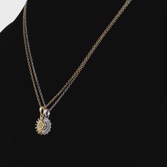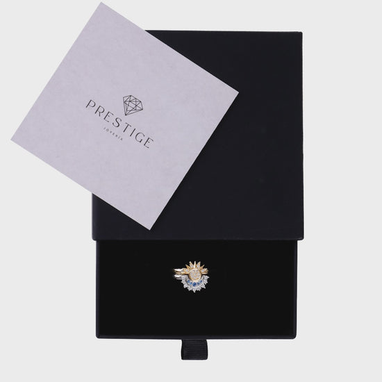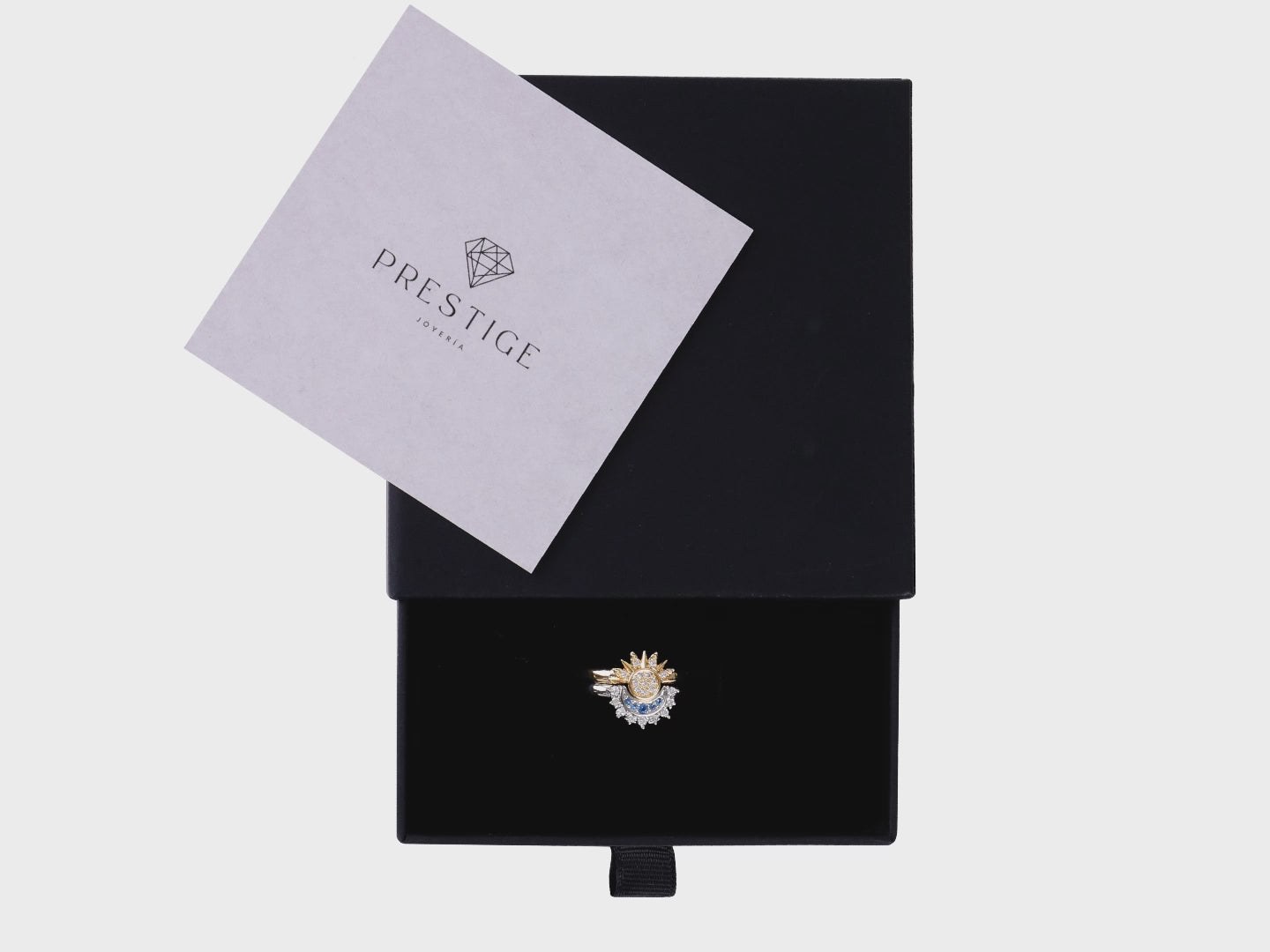 El anillo dorado representa el poder del sol, fuente de vida y luz, mientras que el anillo plateado con detalles en azul profundo evoca la tranquilidad y el misterio de la luna 🌙.